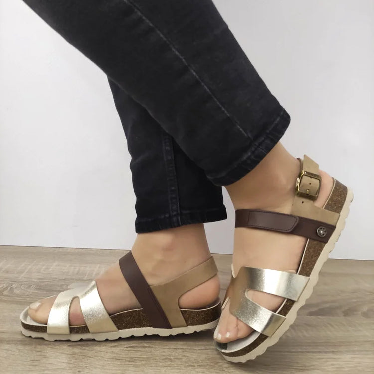 Descriere: ✨ Fii pregătită pentru vară cu un plus de stil și confort! Aceste sandale casual Anekke, în nuanțe calde de auriu și maro, atrag privirile prin designul chic și combinația elegantă de barete din piele naturală și ecologică. Talpa tip plută oferă lejeritate la fiecare pas, iar prinderea cu scai le face ușor de încălțat. 💛 Un model perfect pentru ținute lejere de zi, plimbări sau vacanțe însorite! 🌞