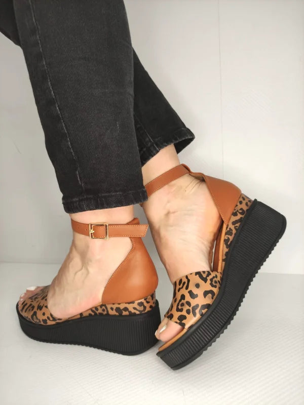 Descriere: Atrage toate privirile cu aceste sandale Dogati cu platformă înaltă și imprimeu leopard în partea frontală. Confecționate din piele naturală, oferă un mix seducător între confort și stil îndrăzneț. Cureaua cu cataramă aurie susține glezna, iar talpa de 7 cm conferă o postură elegantă fără a compromite stabilitatea. Un model ideal pentru ținutele de vară în care vrei să ieși din anonimat – perfecte cu rochii simple, pantaloni scurți sau fuste fluide.