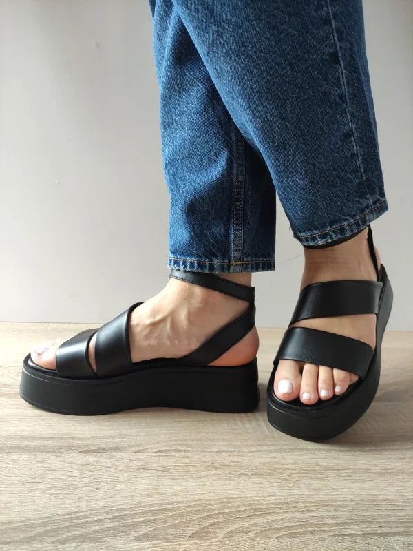 Material: Piele naturală Culoare: Negru Înălțime totală a pantofului: 15 centimetri Grosimea tălpii (la spate): 5 cm Stil: Sandale casual Tip închidere: Velcro (scai) Detalii: Platformă ușoară, barete late, confort sporit la purtare, potrivite pentru ținute urbane sau de vacanță