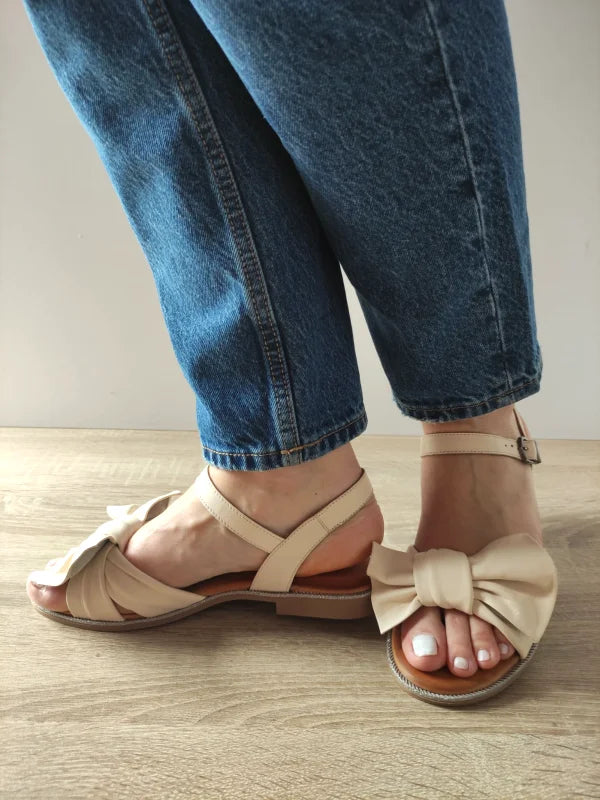 Material: Piele naturală Culoare: Bej Înălțime totală a pantofului: 9 centimetri Grosimea tălpii (la spate): 2 cm Stil: Sandale casual Tip închidere: Cataramă Detalii: Fundă decorativă în față, barete subțiri, aspect feminin