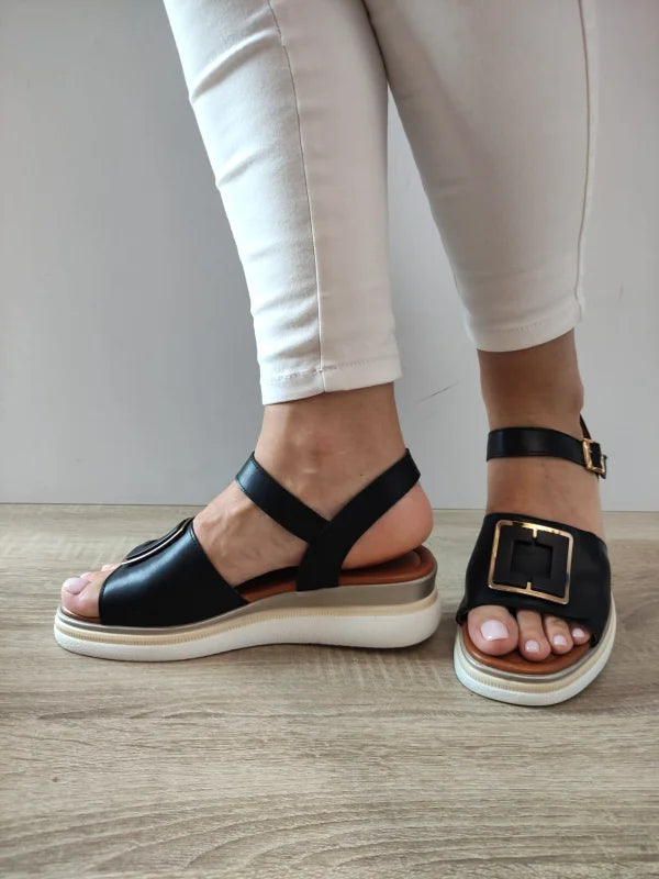 Adaugă un strop de eleganță modernă ținutelor tale de vară cu aceste sandale casual Dogati, realizate din piele naturală de calitate superioară. Designul în nuanță de negru clasic este completat de o cataramă metalică decorativă, oferind un look sofisticat și versatil.