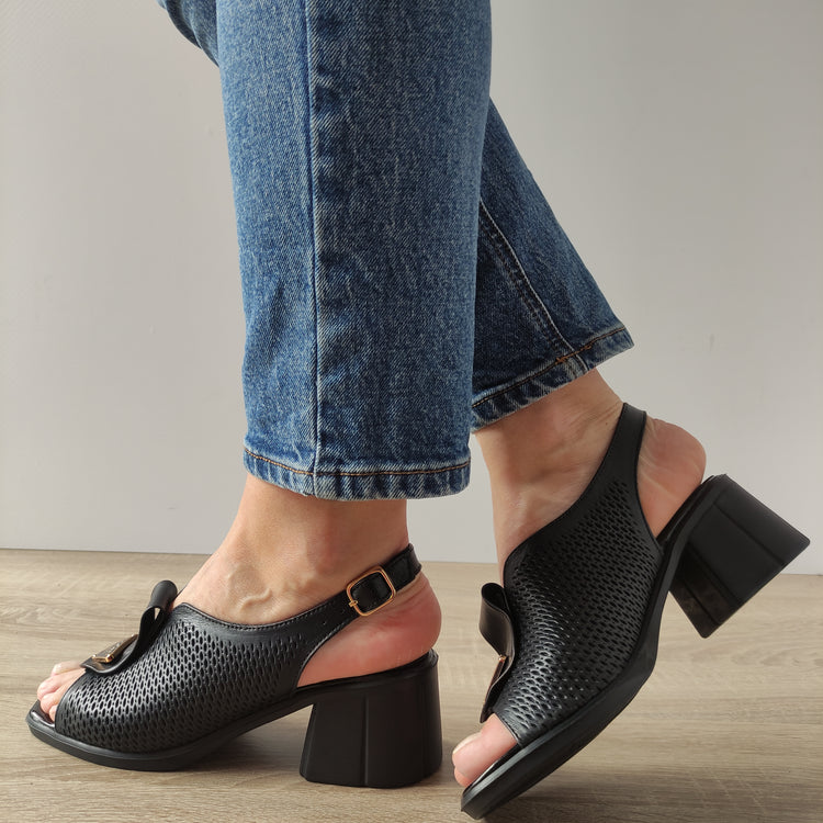 Aceste sandale casual pentru damă de la Dogati sunt ideale pentru sezonul de vară, oferind atât confort cât și eleganță. Modelul 9501-03 este confecționat din piele naturală de culoare neagră, adăugând un aspect sofisticat ținutei tale. Designul perforat și accesoriul decorativ din partea frontală completează stilul modern al sandalelor. Sistemul de închidere cu cataramă asigură o fixare sigură și confortabilă, iar tocul de 6 centimetri oferă înălțime și stabilitate, menținând confortul pe durata întregii zile.