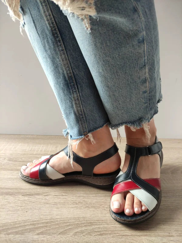 Sandale casual din piele naturală, cu un design colorat și vibrant în nuanțe de bleumarin, alb și roșu. Modelul oferă susținere excelentă datorită baretelor late și prinderii cu scai, fiind perfect pentru zilele în care confortul e prioritar, fără a renunța la un strop de personalitate.