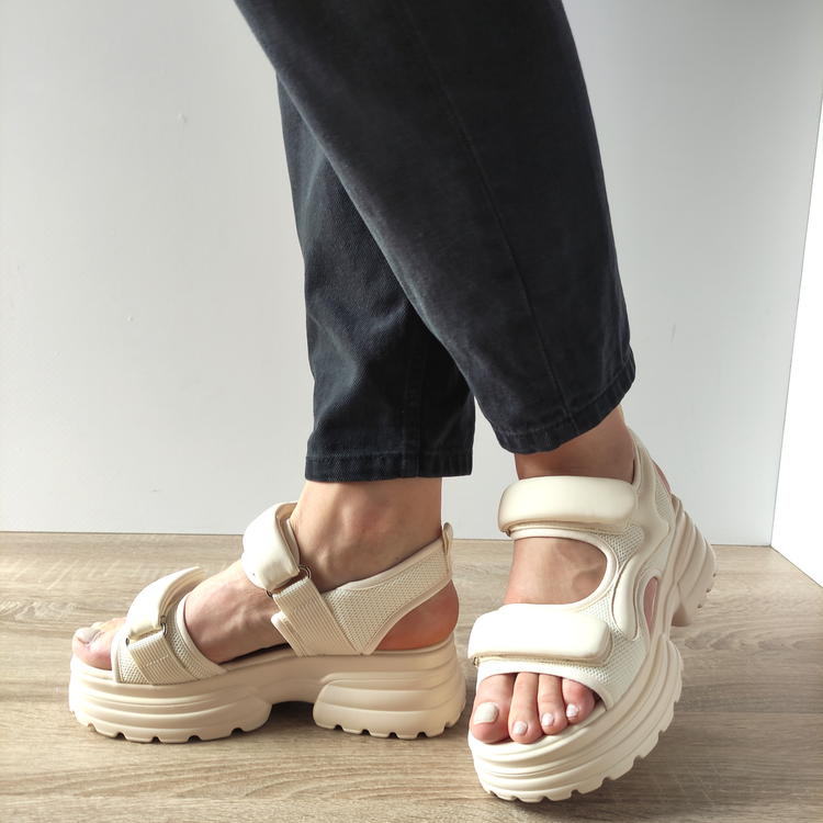 Îți prezentăm sandalele casual de damă FORMAZIONE 1036230, perfecte pentru a adăuga un plus de stil și confort ținutelor tale de vară. Aceste sandale sunt confecționate dintr-o combinație de piele naturală și material textil de culoare crem, oferind un aspect modern și elegant. Sistemul de închidere cu velcro (scai) asigură o ajustare rapidă și sigură, în timp ce talpa de 6 centimetri oferă un suport excelent și o ușoară înălțime.