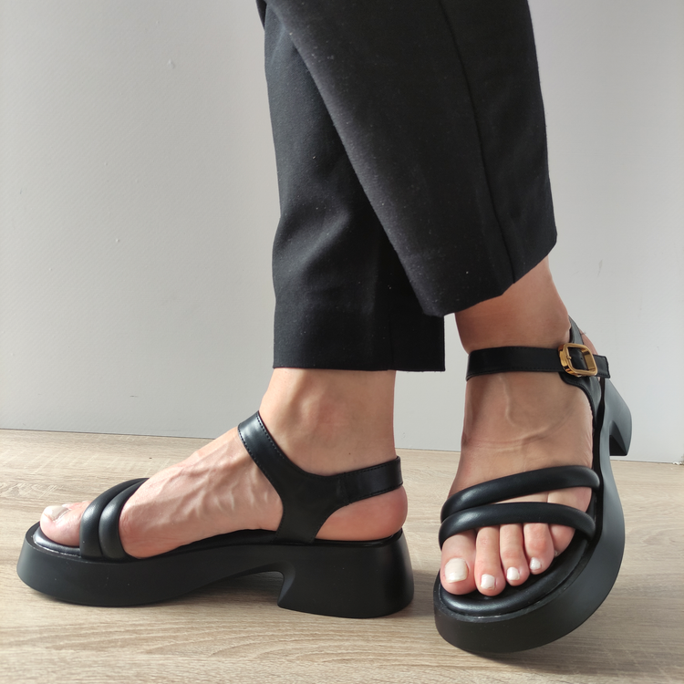 Îți prezentăm sandalele casual pentru damă de la Formazione, modelul 2205-2. Aceste sandale sunt confecționate din piele naturală de culoare neagră, oferind un aspect elegant și durabilitate. Sistemul de închidere cu cataramă asigură o fixare sigură și ajustabilă. Talpa de 4.5 centimetri și înălțimea totală a sandalei de 11 centimetri oferă stabilitate și confort pe durata întregii zile.