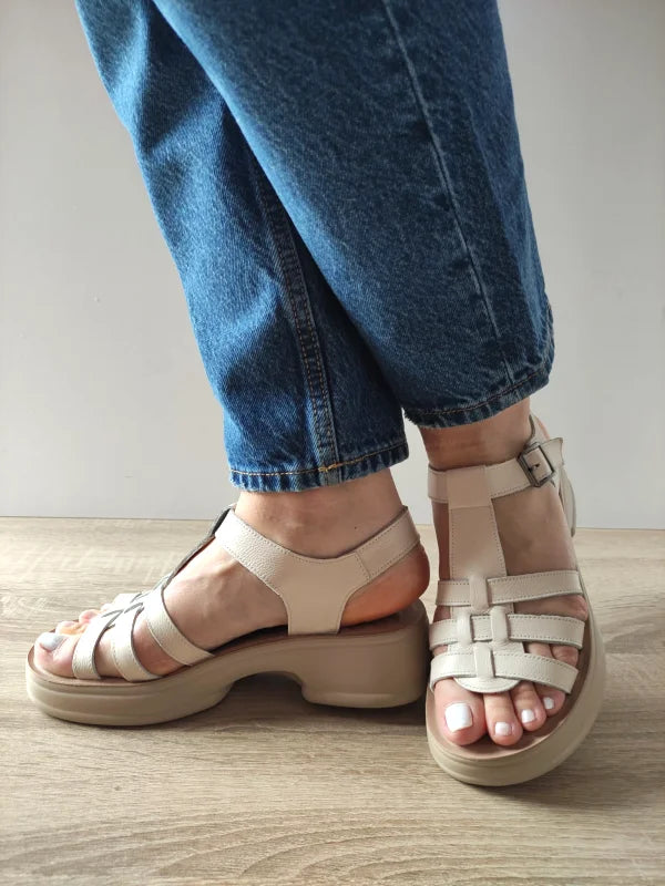 Caracteristici: Culoare: Crem Material exterior: Piele naturală Înălțime totală a sandalei: 12.5 cm Grosimea talpii (la spate): 4.8 cm Tip închidere: Velcro (scai) Stil: Sandale casual