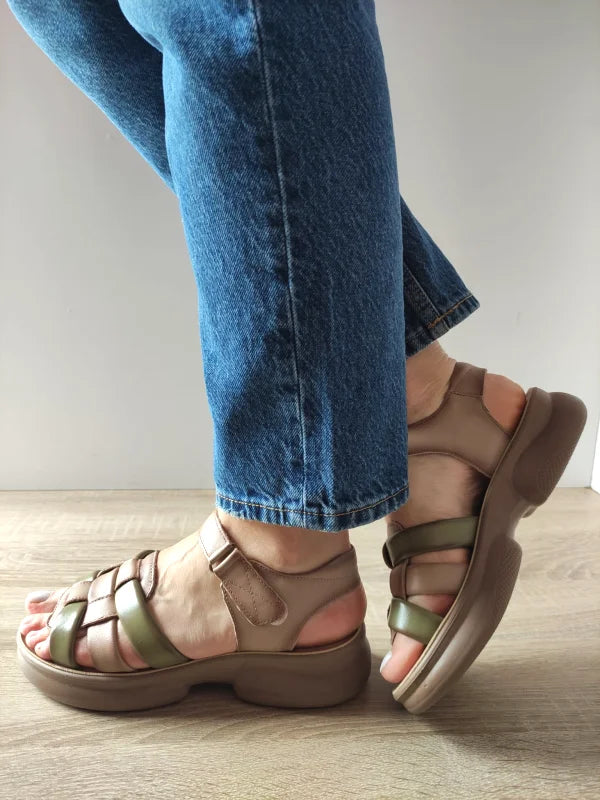 Sandale casual din piele naturală, cu un mix cromatic apricot și verde ce atrage imediat privirea. Baretele late și încrucișate, combinate cu talpa groasă profilată și închiderea practică cu scai, oferă un plus de confort și stabilitate. O alegere excelentă pentru ținute lejere, cu personalitate.