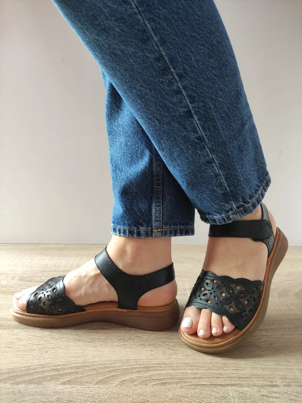 Descoperă combinația perfectă între funcționalitate și stil cu sandalele FORMAZIONE 33177 în nuanță negru clasic, ideale pentru zilele călduroase. Realizate din piele naturală, cu un design floral perforat și margini delicate ondulate, aceste sandale oferă un aspect rafinat și aerisit. Închiderea practică cu scai (velcro) asigură o fixare rapidă și sigură, iar talpa confortabilă, de 3.5 cm, susține piciorul întreaga zi.