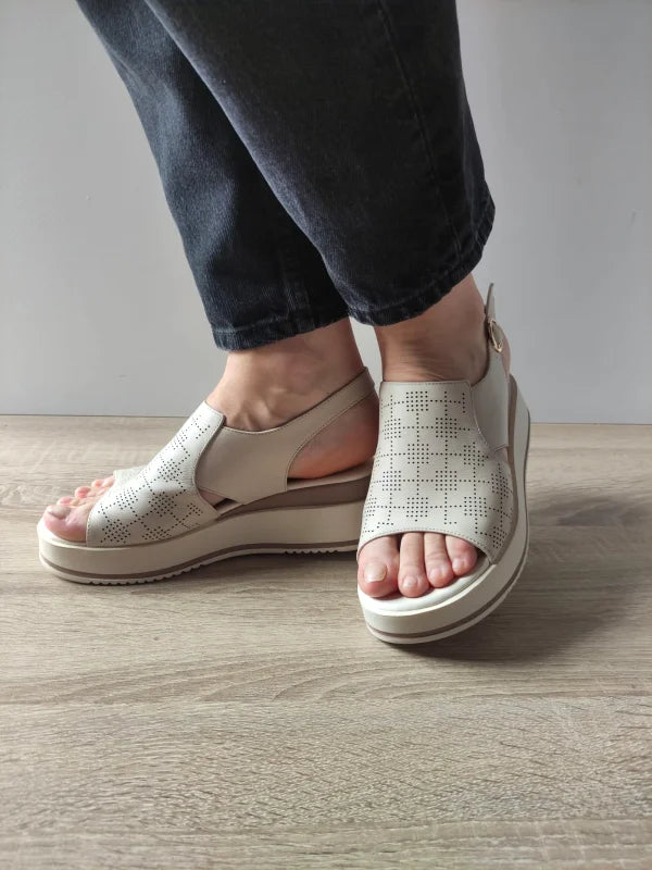 Sandale casual cu platformă, realizate din piele naturală perforată, cu un design modern și curat. Nuanța crem și talpa groasă oferă un look fresh și versatil, iar sistemul de prindere cu cataramă laterală asigură o fixare sigură. Ideale pentru ținute de vară în care vrei să câștigi înălțime fără să pierzi din confort.
