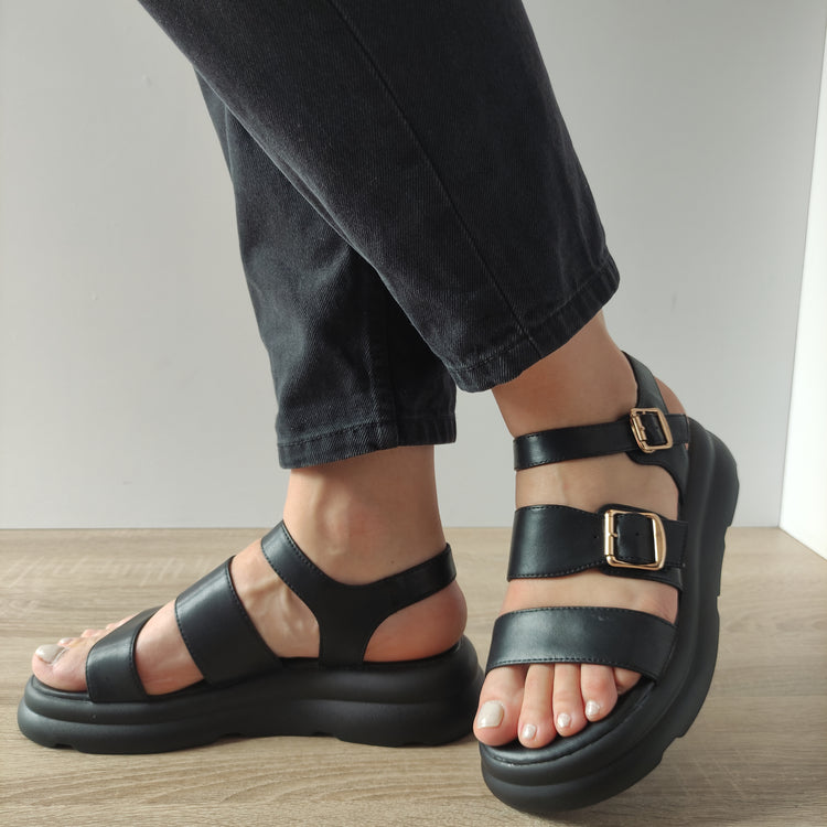 Material exterior: Piele naturala Culoare: Negru Tip închidere: Catarama Tip: Sandale casual Gen: Dama Înălțimea totală: 12.5 centimetri Grosimea tălpii: 4.5 centimetri