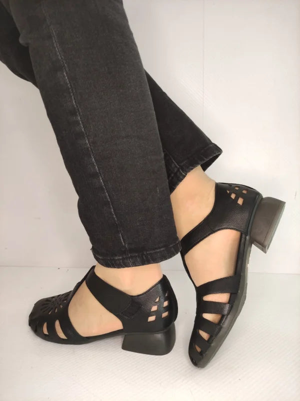 Descriere: Confecționate din piele naturală, aceste sandale casual îmbină rafinamentul cu funcționalitatea. Detaliile decupate cu model geometric și vârful semi-închis adaugă un plus de stil și aerisire, ideale pentru sezonul cald. Închiderea cu velcro (scai) permite ajustarea rapidă și precisă pe picior, iar tocul jos de 3 cm este perfect pentru confortul de zi cu zi.
