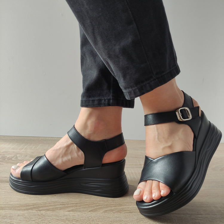 Material exterior: Piele naturala Culoare: Negru Tip închidere: Catarama Tip: Sandale casual Gen: Dama Înălțimea totală: 12.5 centimetri Grosimea tălpii: 6.5 centimetri