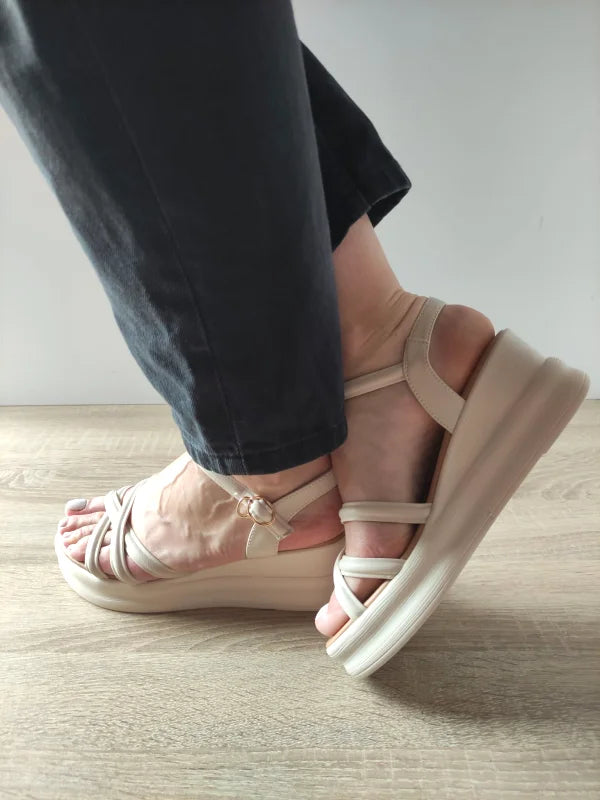 Descriere: Un model delicat și modern, sandalele FORMAZIONE 991-1 sunt alegerea perfectă pentru vară. Confecționate din piele naturală crem, cu barete subțiri încrucișate și cataramă reglabilă pe gleznă, aceste sandale oferă atât stil, cât și stabilitate. Talpa groasă de 6.5 cm asigură confort la purtare, în timp ce designul ușor curbat adaugă o notă elegantă și feminină.