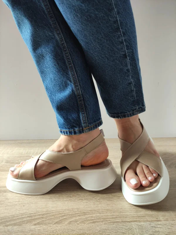 Sandale casual din piele naturală, cu un design îndrăzneț și talpă groasă ondulată ce adaugă un plus de stil. Baretele late încrucișate asigură o fixare stabilă, iar nuanța apricot le face ușor de asortat cu orice ținută lejeră. Ideal pentru femeile care caută confort și originalitate.