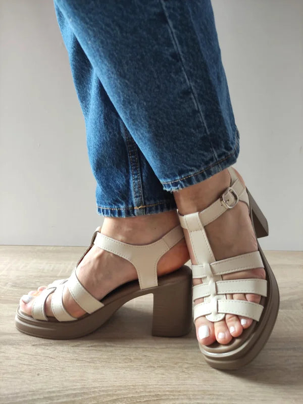 Sandale elegante din piele naturală, ideale pentru a adăuga un plus de rafinament ținutelor casual. Designul cu barete multiple și toc gros înalt oferă un look feminin și stabilitate în același timp. Culoarea crem le face versatile și ușor de asortat cu outfituri de zi sau de seară.