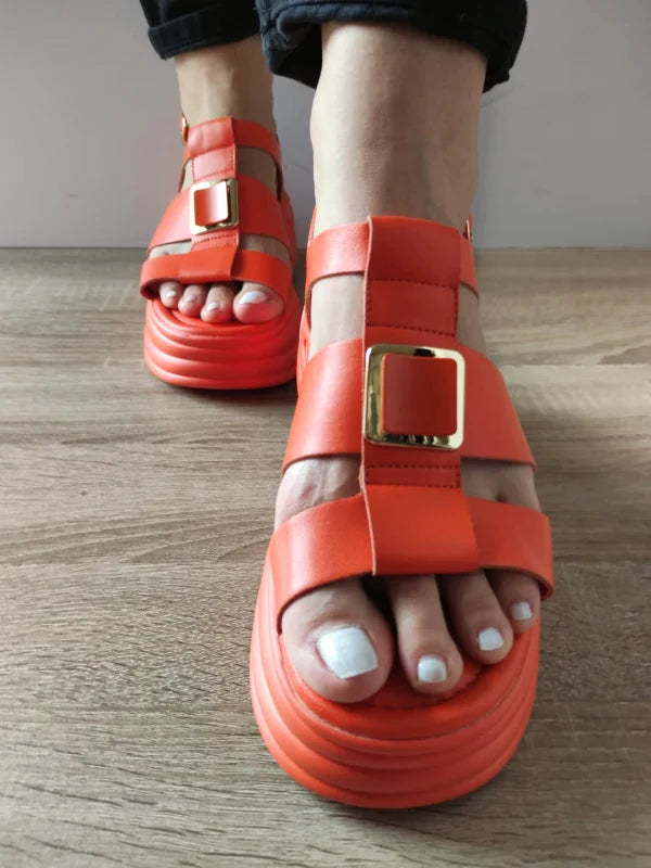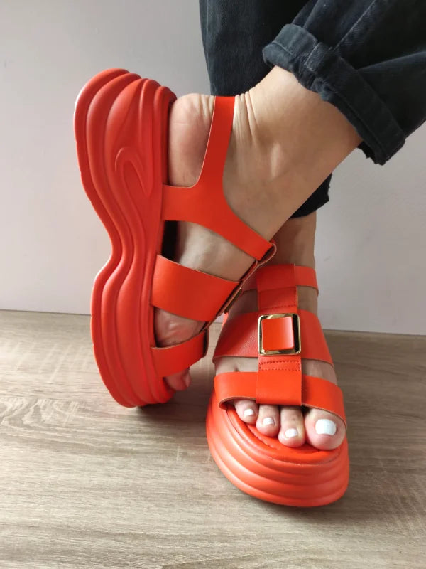 Fii îndrăzneață și ieși în evidență cu aceste sandale casual de damă în nuanța electrizantă de portocaliu intens. Realizate din piele naturală, cu un design robust și o platformă de 6.5 cm, aceste sandale nu sunt doar un statement vizual, ci oferă și un plus de confort și stabilitate. Catarama decorativă frontală adaugă un detaliu stilizat, în timp ce talpa cu formă ondulată conferă un aspect modern și nonconformist. O alegere perfectă pentru femeile care vor să combine stilul urban cu confortul de zi cu zi.