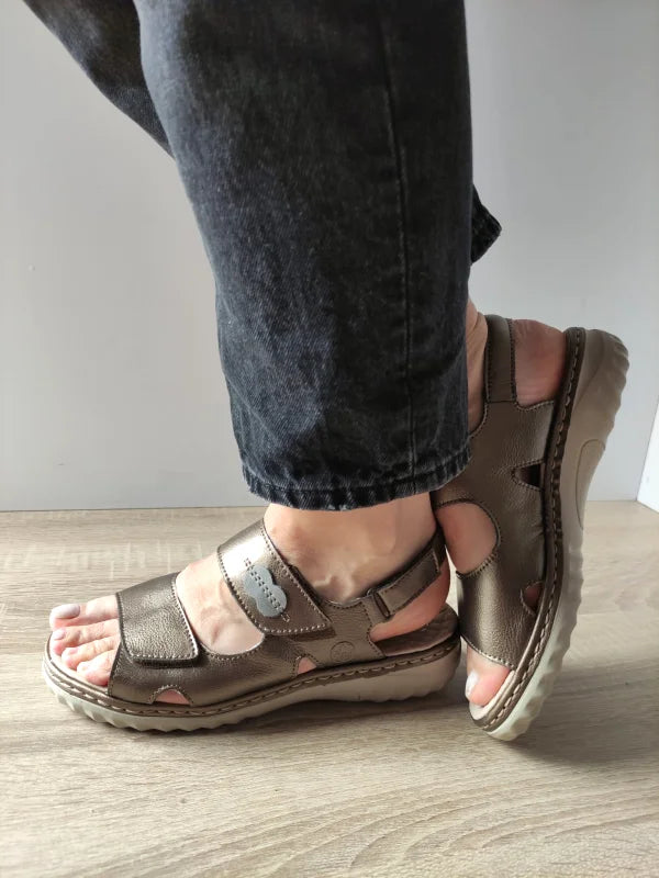 Designul funcțional și stilul urban se întâlnesc în aceste sandale Rieker, concepute pentru femeile active care își doresc confort pe tot parcursul zilei. Baretele late cu închidere Velcro (scai) permit ajustarea perfectă pe picior, iar talpa comodă, cu grosime de 3.8 cm, oferă o susținere excelentă. Nuanta bronze adaugă un accent rafinat și versatil, potrivit pentru ținute casual de zi cu zi.