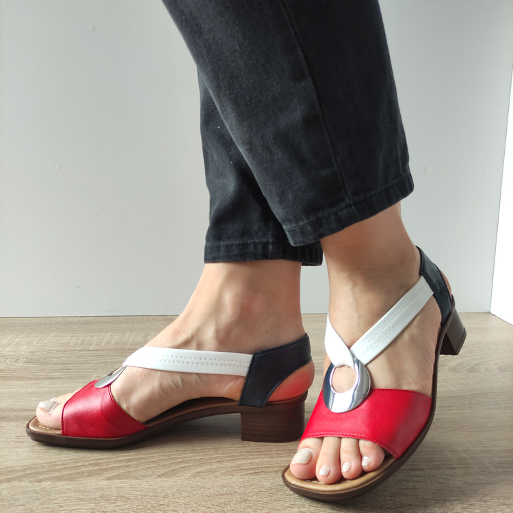 Îți prezentăm sandalele casual de damă Rieker 62662-35, ideale pentru a aduce un strop de culoare și confort ținutelor tale de vară. Aceste sandale sunt confecționate din piele ecologică și vin într-o combinație vibrantă de roșu, alb și bleumarin. Designul lor modern și practic include un sistem de închidere slip-on, oferind o încălțare rapidă și confortabilă. Talpa are o grosime de 4 centimetri, asigurând suportul necesar pe durata întregii zile, iar înălțimea totală a sandalei este de 10.5 centimetri.