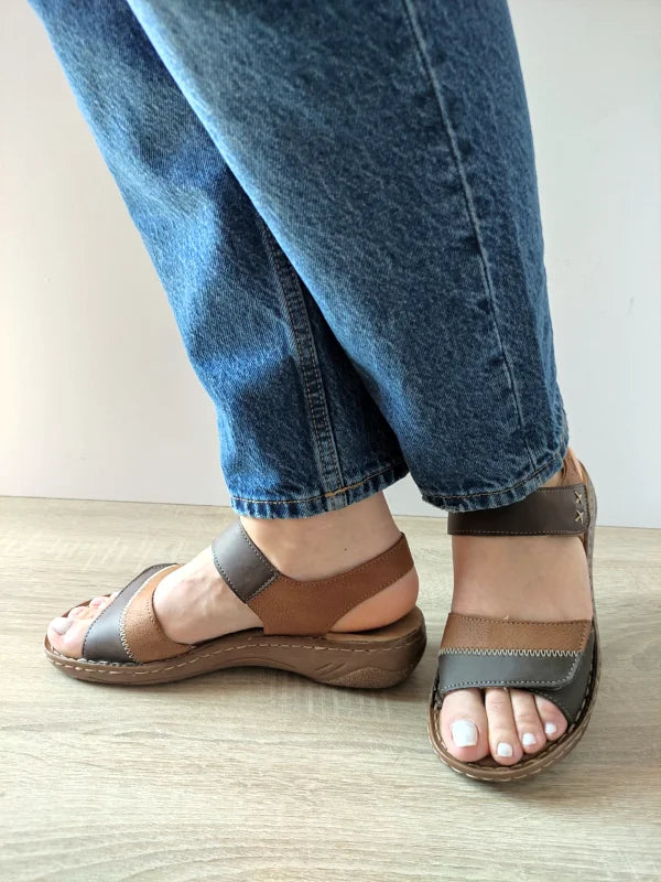 Design casual, cu combinație de culori maro și camel, perfect pentru ținute relaxate de vară