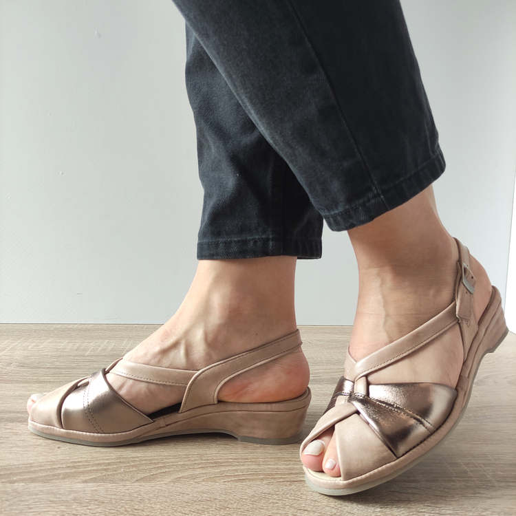 Material exterior: Piele naturală Tip închidere: Catarama Tip: Sandale casual Gen: Damă Culoare: Bej + aramiu Grosimea tălpii (toc): 4 cm Înălțimea totală a sandalei: 9 cm