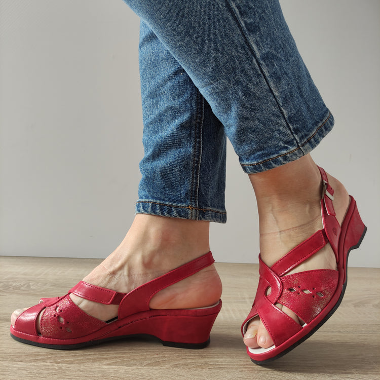 Material exterior: Piele naturală Tip închidere: Cataramă Tip: Sandale casual Gen: Damă Culoare: Roșu Grosimea tălpii (toc): 4.5 centimetri Înălțimea totală a pantofului: 10 centimetri