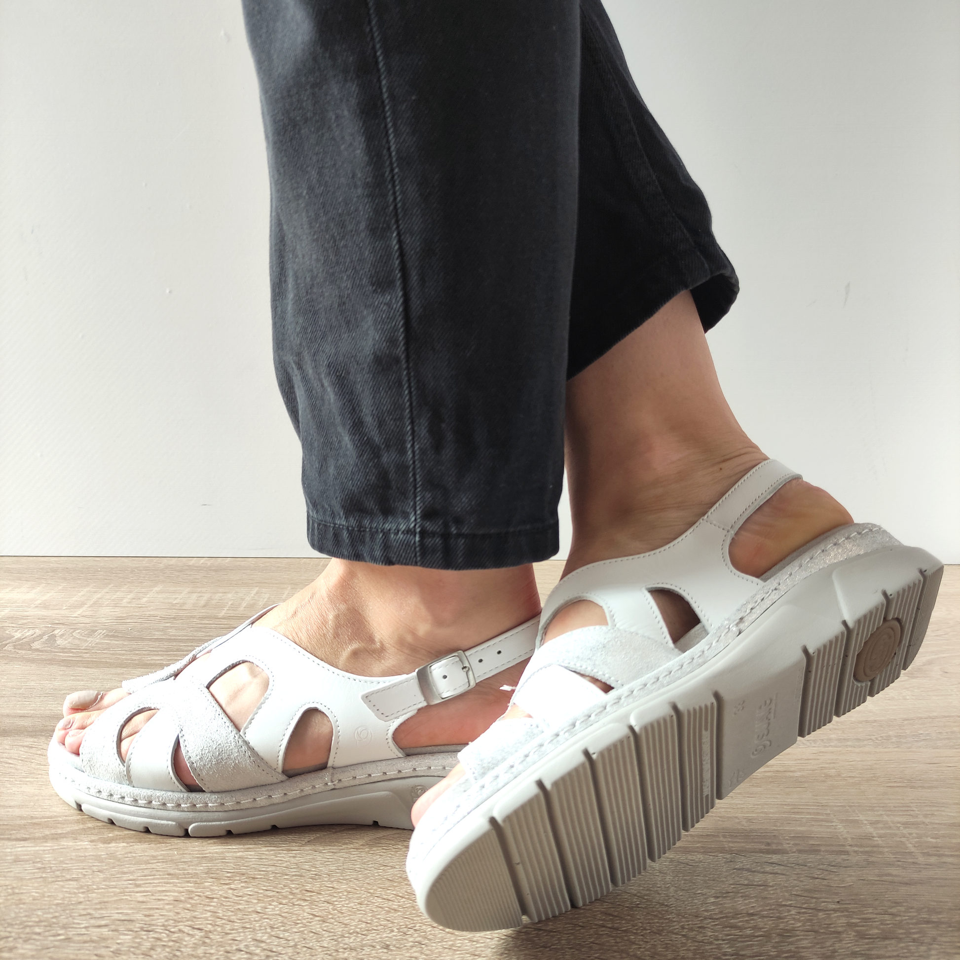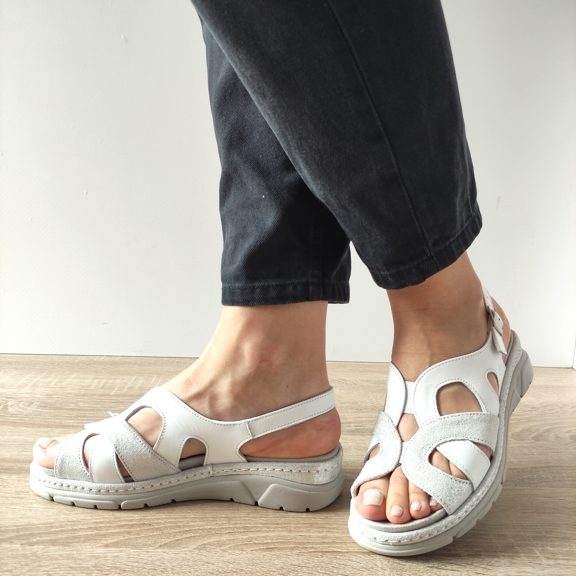 Material exterior: Piele naturală Tip închidere: Cataramă Tip: Sandale casual Gen: Damă Culoare: Alb + argintiu Grosimea tălpii (toc): 4 cm Înălțimea totală a pantofului: 10.5 centimetri Cod produs: Suave 12503VT Mostar 13-N