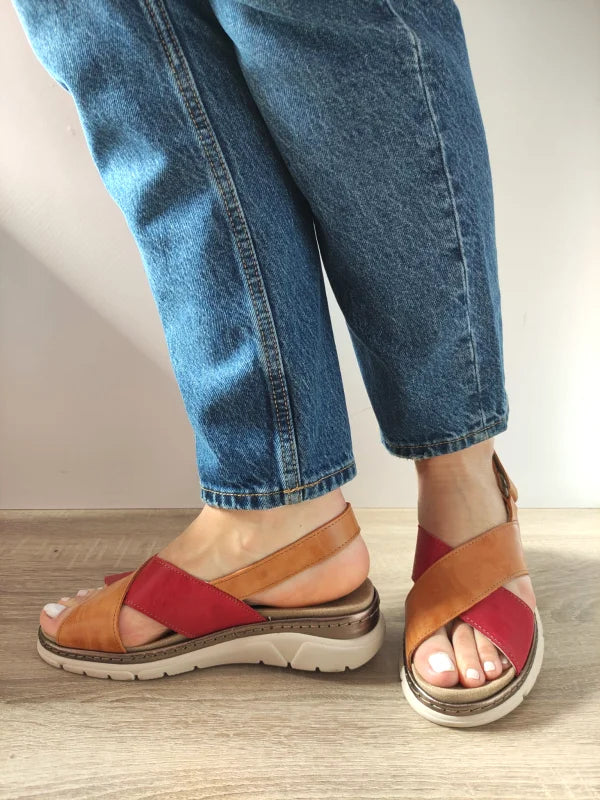 Sandale casual Suave cu un design expresiv, realizate din piele naturală și piele întoarsă în nuanțe calde de cărămiziu și roșu intens. Talpa anatomică și branțul detașabil oferă confort maxim pe tot parcursul zilei, fiind ideale pentru plimbări sau activități zilnice. Sistemul de închidere cu scai (velcro) asigură o fixare eficientă și rapidă. Modelul iese în evidență prin combinația cromatică deosebită și detaliile fine.