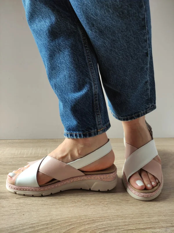Sandale casual Suave confecționate din piele naturală și piele întoarsă, într-o combinație elegantă de alb și roz nude. Talpa flexibilă cu brant detașabil oferă susținere optimă, iar închiderea cu scai (velcro) permite o fixare ușoară și rapidă. Designul cu barete încrucișate adaugă un aer modern, ideal pentru zilele călduroase în care îți dorești confort și stil.