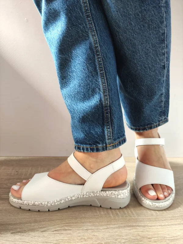 Sandale casual Suave realizate din piele naturală albă, cu un design simplu și elegant, perfect pentru vară. Talpa comodă și brantul detașabil oferă confort pe tot parcursul zilei, iar închiderea cu scai (velcro) permite ajustarea rapidă și precisă. Talpa decorativă cu detalii discrete completează aspectul modern și feminin.