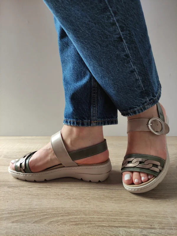 Sandalele Suave 20000T Krabi combină perfect stilul modern cu confortul zilnic, fiind alegerea ideală pentru zilele călduroase. Realizate din piele naturală în nuanțe elegante de kaki, bej și accente bronze, acest model se remarcă prin bareta frontală decorativă tip lanț și prin designul ergonomic al tălpii. Închiderea cu scai (velcro) oferă o fixare practică, iar branțul detașabil contribuie la un plus de igienă și comoditate.