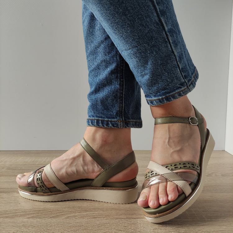 Îți prezentăm sandalele casual pentru damă Tamaris 28255-42, confecționate din piele naturală de înaltă calitate, perfecte pentru a adăuga un plus de confort și stil garderobei tale. Cu un design în nuanțele elegante de olive și bej, aceste sandale sunt ideale pentru zilele călduroase de vară, asigurând un look modern și rafinat. Sistemul de închidere cu cataramă facilitează o fixare sigură și comodă, iar talpa de 11 centimetri înălțime oferă stabilitate și suport.