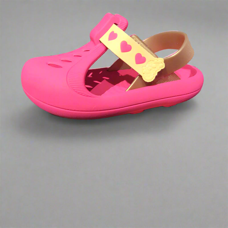 Sandale pentru copii Ipanema Little Baby în nuanță fuxia intens, cu detalii simpatice în formă de inimioare roz pe bareta galbenă. Confecționate din cauciuc moale și flexibil, sunt ideale pentru pașii jucăuși ai celor mici. Sistemul de închidere cu Velcro (scai) facilitează încălțarea rapidă, iar designul închis în față oferă protecție suplimentară degetelor. Confortabile, colorate și sigure – perfecte pentru joacă în sezonul cald.