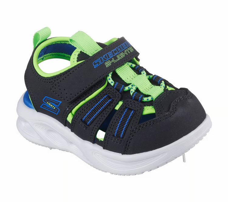 Sandale pentru copii Skechers S-Lights, în combinație negru cu verde neon, cu design sport și talpă iluminată la fiecare pas. Confecționate din piele ecologică rezistentă, sunt ideale pentru joacă și aventuri zilnice. Sistemul Velcro (scai) asigură o încălțare rapidă și sigură, iar talpa flexibilă de 3 cm oferă confort și stabilitate pe tot parcursul zilei. Perfecte pentru micii pasionați de mișcare și lumină!