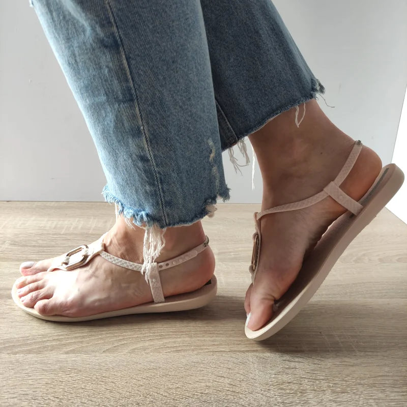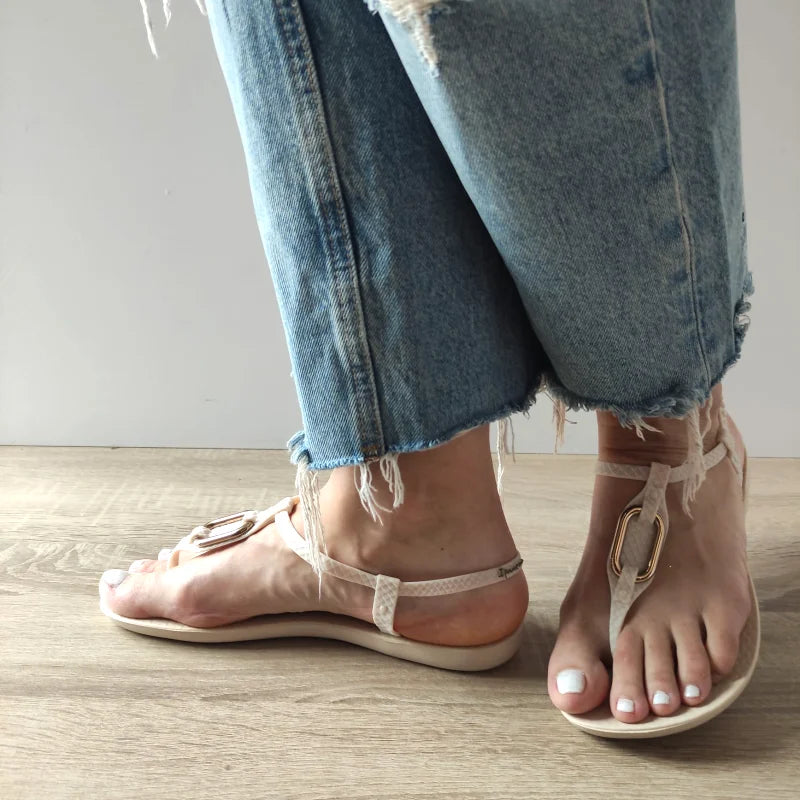 Sandale de damă Ipanema Class Linea, în nuanță bej deschis, cu un design delicat și detalii elegante. Modelul dispune de o aplicație decorativă aurie în partea frontală, care oferă un plus de rafinament. Confecționate din cauciuc moale și confortabil, sunt ideale pentru purtare zilnică. Sistemul de închidere cu cataramă permite o fixare sigură și reglabilă. Un model feminin, versatil și ușor de asortat în ținutele de vară.