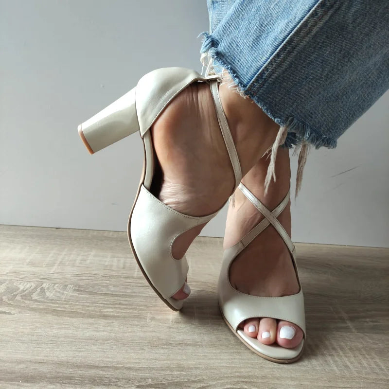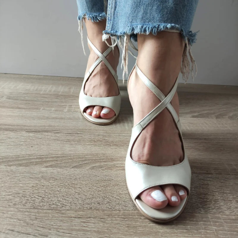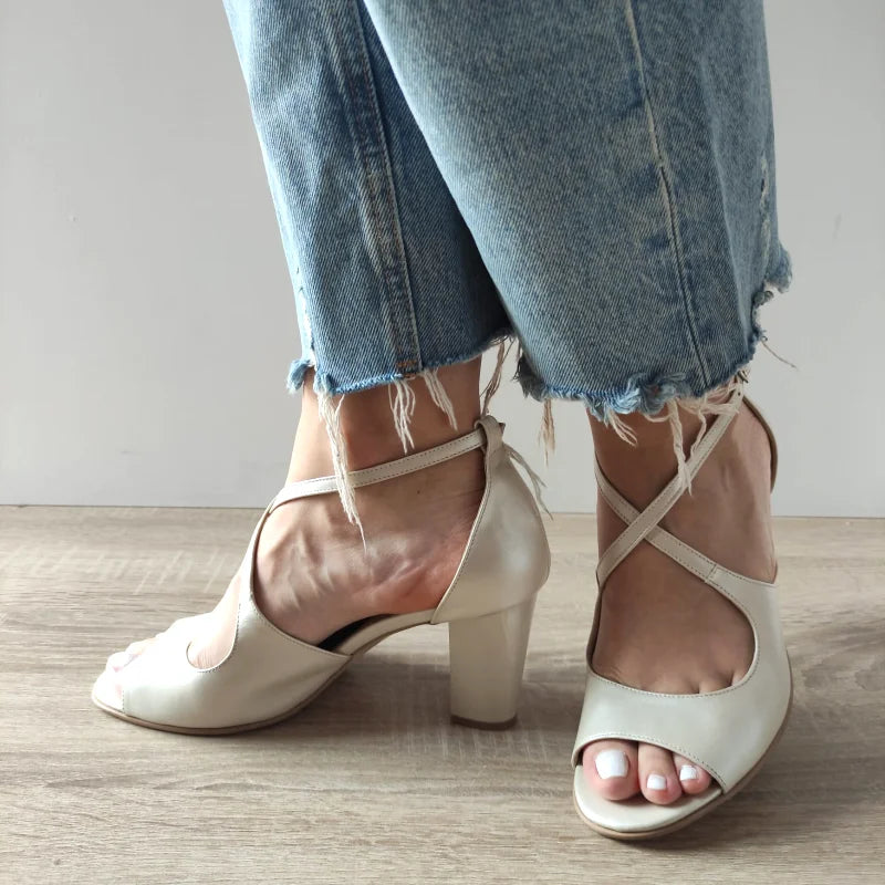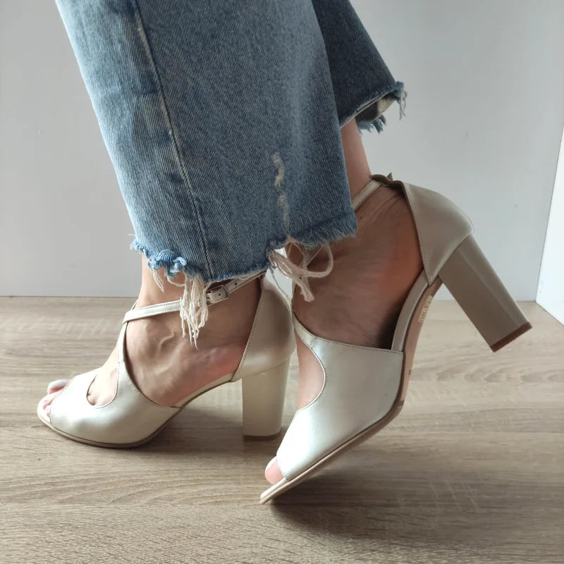 Sandale elegante de damă Antonio, în nuanță bej sidefat, cu un design rafinat și finisaj ușor lucios. Baretele fine încrucișate oferă un plus de feminitate și susținere, iar tocul gros de 7.8 cm asigură stabilitate și confort la purtare. Sistemul de închidere cu cataramă permite o ajustare sigură și precisă. Model ideal pentru ținute de ocazie, nunți, botezuri sau evenimente speciale.