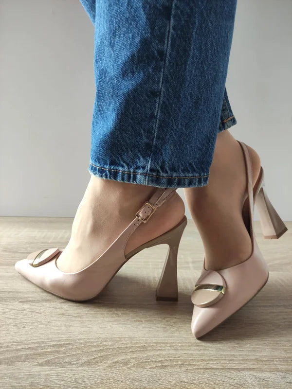 Pentru apariții de neuitat, aceste sandale Epica sunt alegerea ideală! Realizate din piele naturală fină în nuanță roz nude, îți pun în valoare feminitatea printr-un design elegant, cu vârf ascuțit și decupaj la spate. Detaliul metalic de pe partea frontală adaugă un plus de rafinament, în timp ce tocul subțire, înalt de 10 cm, oferă o siluetă sofisticată și o postură încrezătoare. Modelul este prevăzut cu prindere discretă cu baretă și cataramă, pentru susținere sigură și stil aparte.