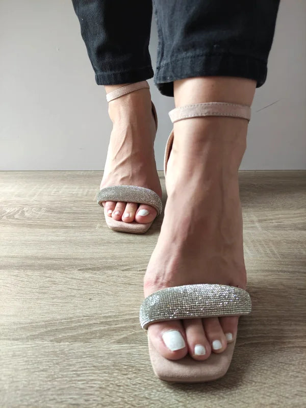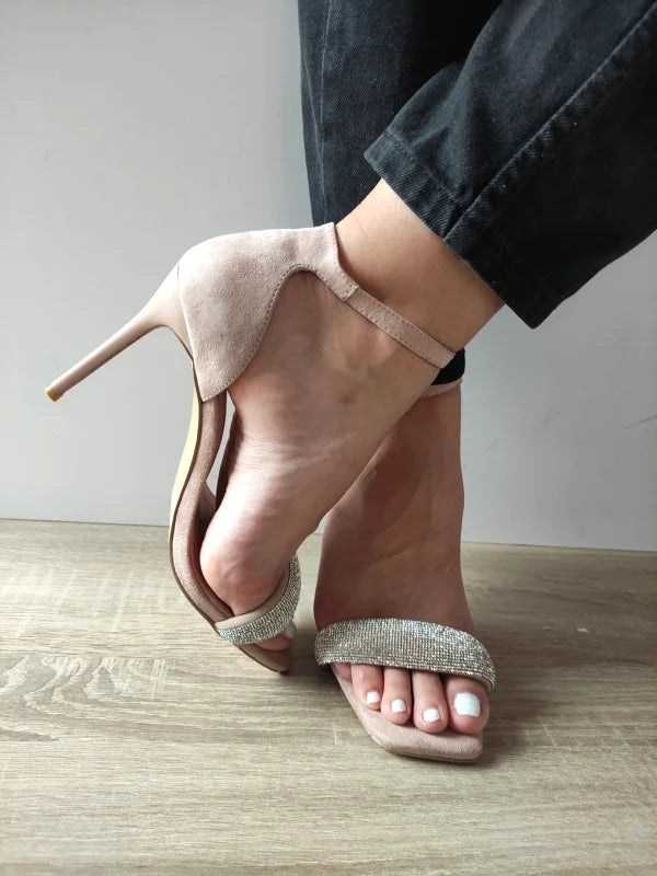 Fii rafinată și strălucește la fiecare pas cu aceste sandale elegante din piele naturală întoarsă, în nuanța delicată bej nude. Designul sofisticat este evidențiat de bareta frontală cu pietricele strălucitoare, completată de tocul subțire de 10.5 cm, perfect pentru ocazii speciale. Baretă fină cu cataramă pentru susținere discretă și siluetă elegantă.