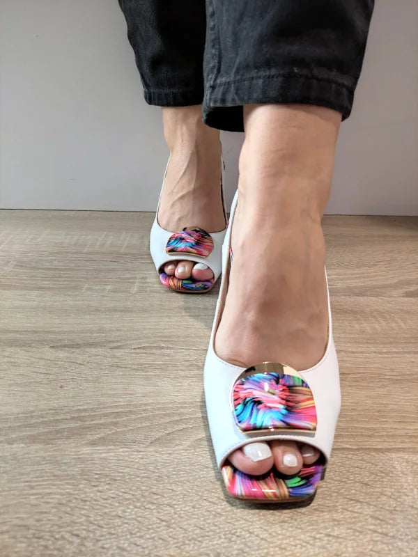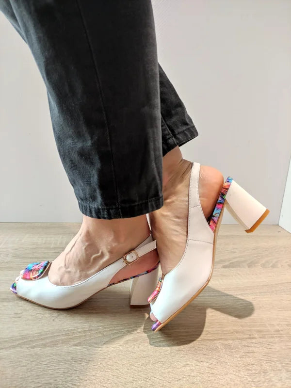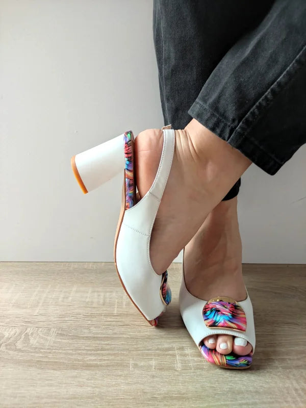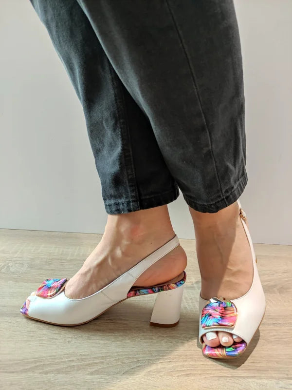 Un model sofisticat cu accente florale multicolore, perfect pentru a adăuga prospețime și originalitate ținutelor elegante. Aceste sandale din piele naturală albă se remarcă prin fundița decorativă vibrantă și tocul gros, stabil, de 7.8 cm, care îmbină confortul cu stilul.