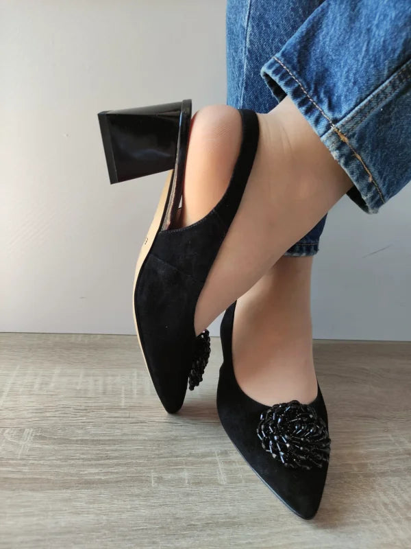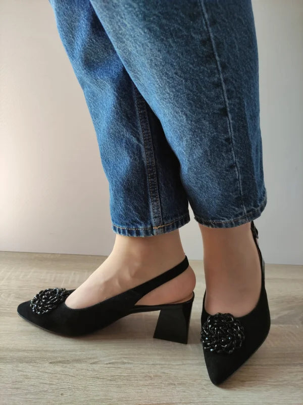 Ornamentul din mărgele negre aplicat pe partea frontală adaugă o notă distinctivă și sofisticată întregii perechi.