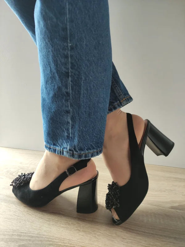 Aceste sandale elegante Epica îmbină perfect rafinamentul texturii de piele naturală întoarsă cu un detaliu strălucitor care atrage toate privirile – aplicația decorativă frontală cu aspect de bijuterie. Cu un design deschis la spate și vârf decupat, oferă o notă de senzualitate și eleganță clasică. Tocul gros de 8.3 cm contribuie la o postură elegantă, fără a sacrifica stabilitatea, iar bareta cu cataramă reglabilă asigură o fixare sigură și confortabilă.