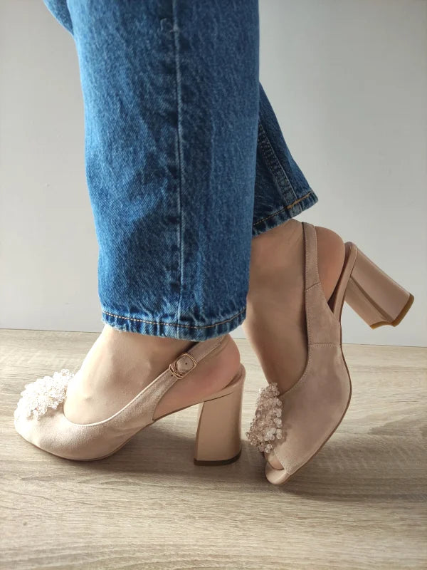 Aceste sandale elegante Epica adaugă o notă de rafinament oricărei ținute, fiind realizate din piele naturală întoarsă de culoare bej. Detaliul decorativ cu mărgele frontale conferă un efect sofisticat și feminin, perfect pentru evenimente speciale. Tocul gros de 8.3 cm oferă stabilitate și confort, iar designul decupat cu vârf deschis scoate în evidență linia piciorului într-un mod grațios. Bareta reglabilă cu cataramă asigură o fixare ușoară și sigură.