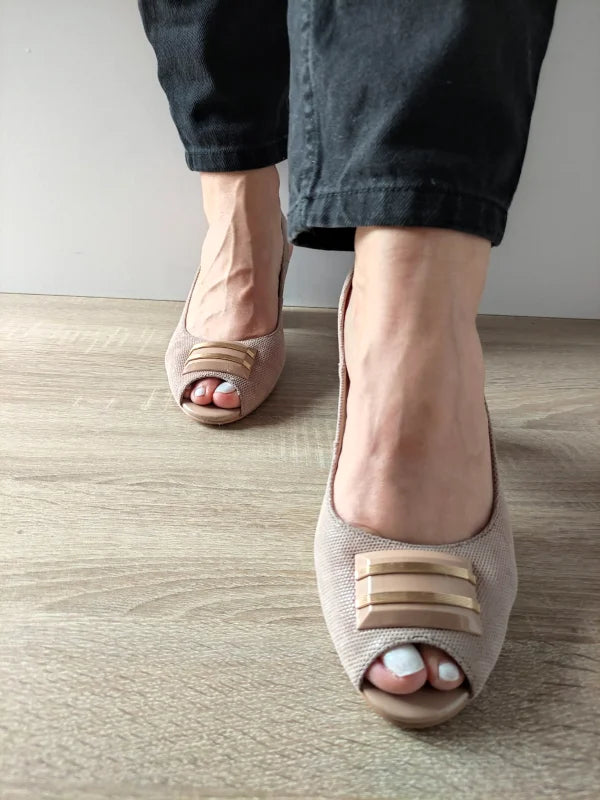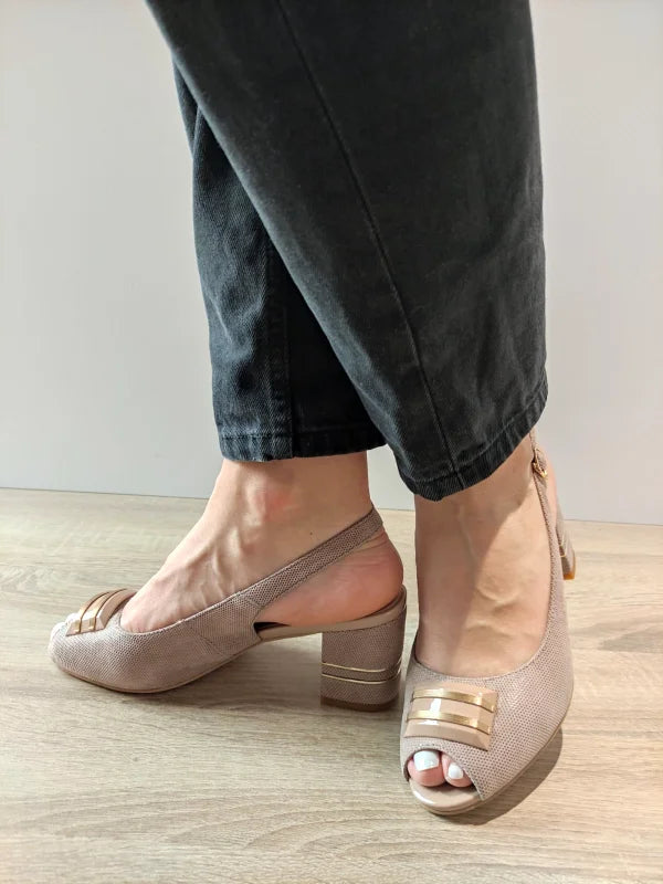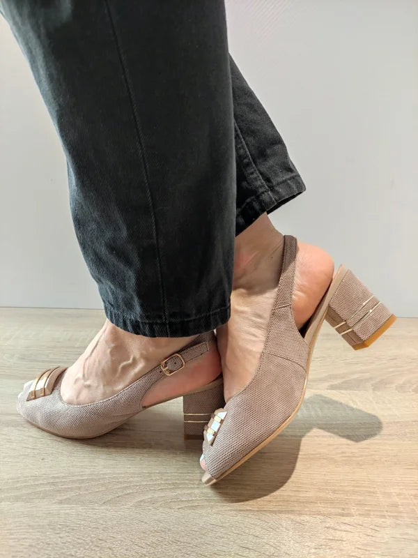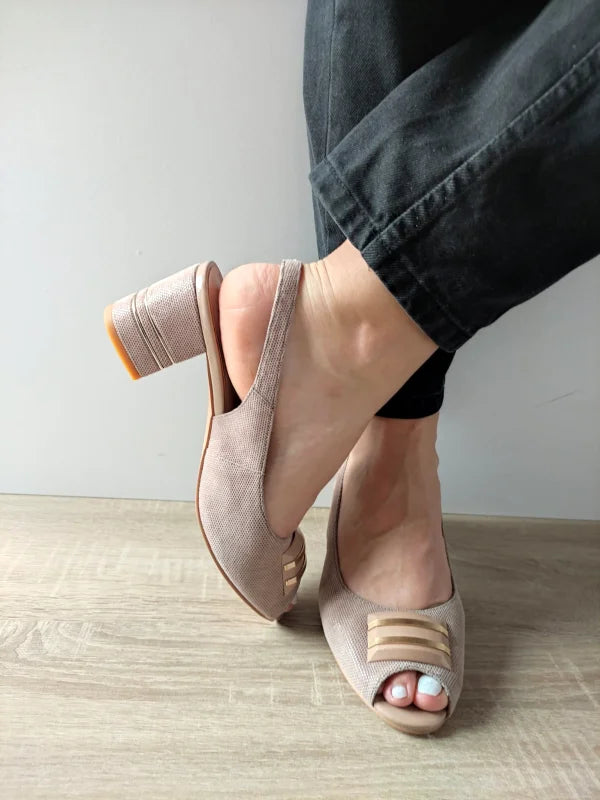 Un model sofisticat cu detalii atent lucrate, aceste sandale elegante atrag toate privirile prin designul imprimat delicat și aplicația decorativă discretă din față. Tocul gros cu detalii aurii în relief adaugă o notă de rafinament și stabilitate în același timp. Pielea naturală întoarsă oferă un plus de confort și finețe tactilă.