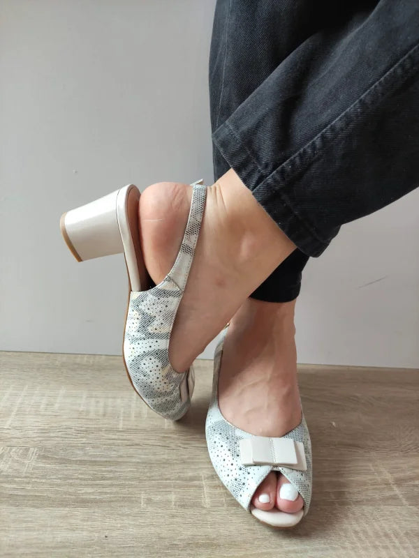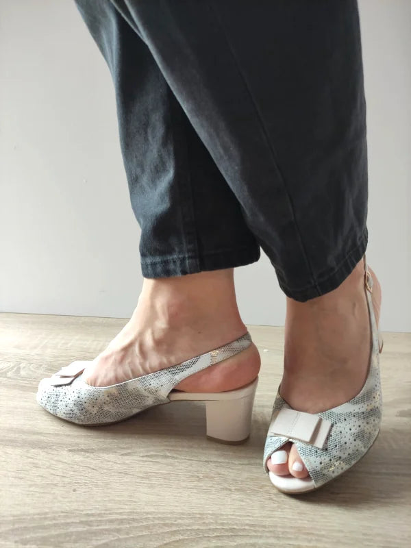 Adaugă o notă de rafinament ținutelor tale cu aceste sandale elegante de la Epica, realizate din piele naturală nubuck de înaltă calitate. Textura discret metalizată și fundița decorativă aduc un plus de stil, iar tocul mediu de 6.5 cm oferă echilibrul perfect între eleganță și confort. Sistemul de prindere cu cataramă asigură o fixare sigură și precisă.