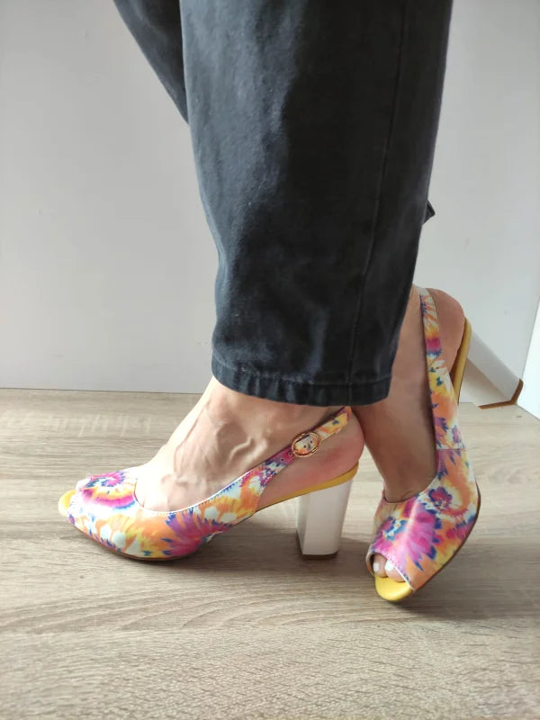 Transformă orice apariție într-una memorabilă cu aceste sandale elegante din piele naturală, în imprimeu floral intens de roz și galben. Designul feminin este accentuat de tocul gros de 8 cm, care oferă stabilitate fără a compromite rafinamentul. Închidere cu cataramă laterală pentru o fixare sigură și confortabilă. Un model ideal pentru evenimente speciale sau ținute statement de vară.