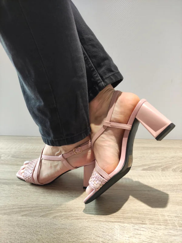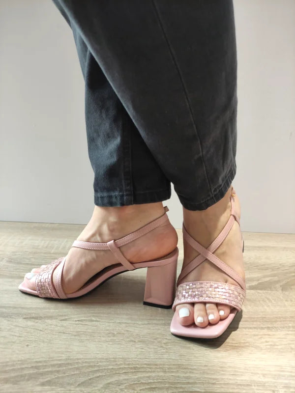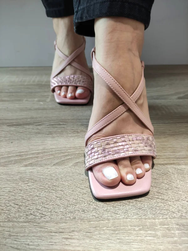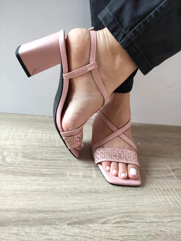 Aceste sandale elegante atrag imediat privirea prin reflexiile metalice discrete și designul rafinat, cu barete încrucișate și străluciri fine care pun în valoare orice ținută de ocazie. Tocul gros și stabil conferă confort, iar vârful pătrat adaugă un aer modern și sofisticat. Un model ideal pentru rochii vaporoase, ținute de cocktail sau petreceri elegante.