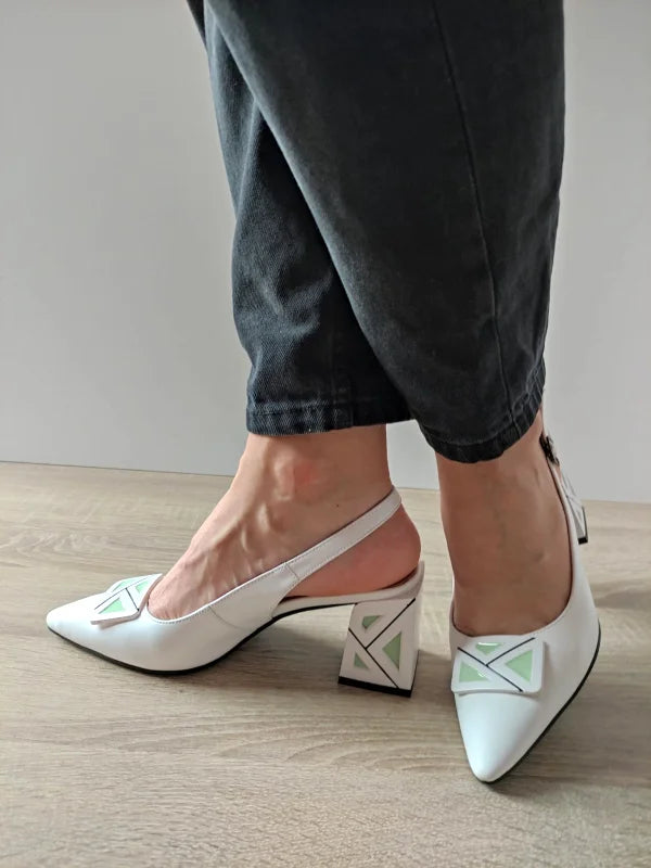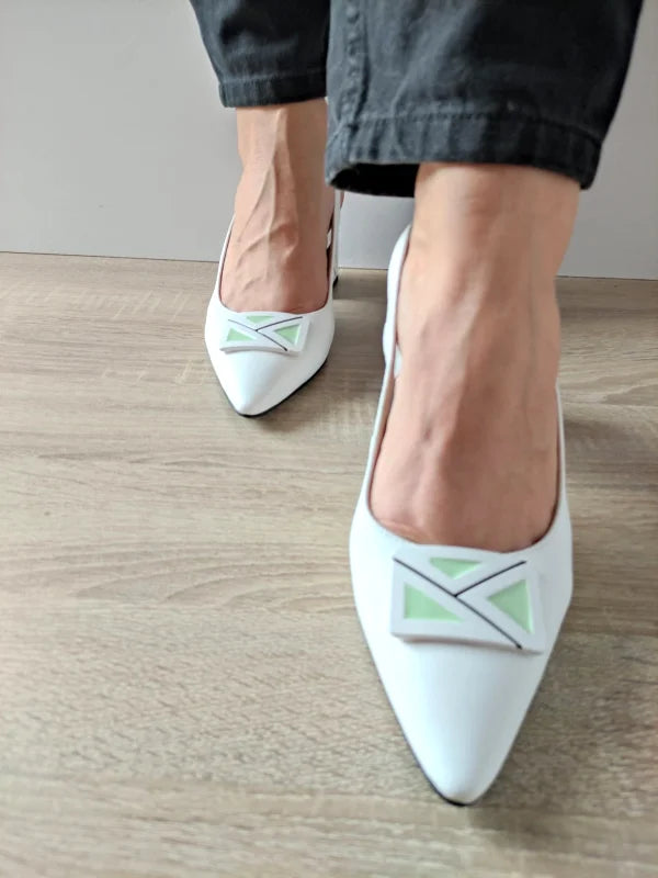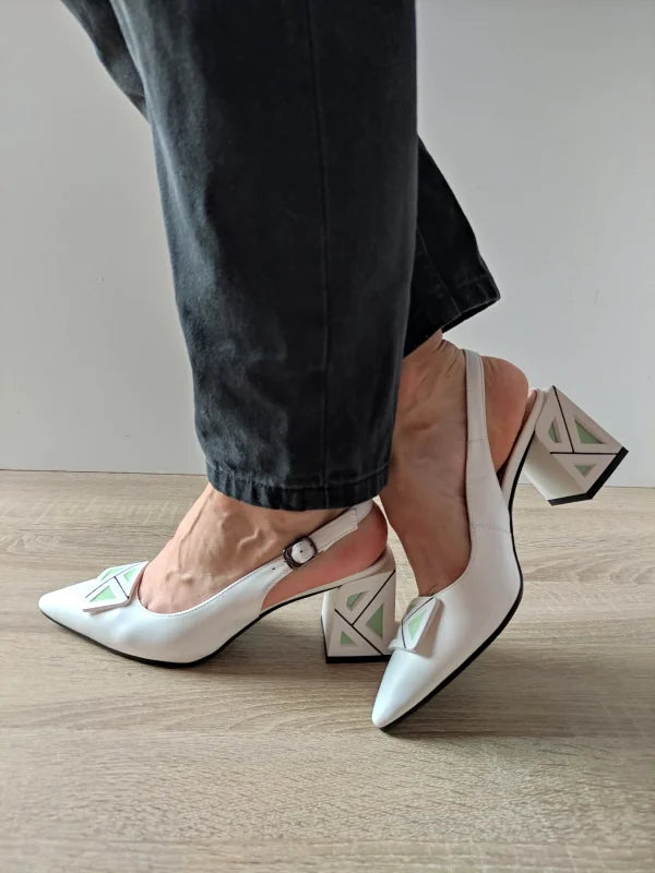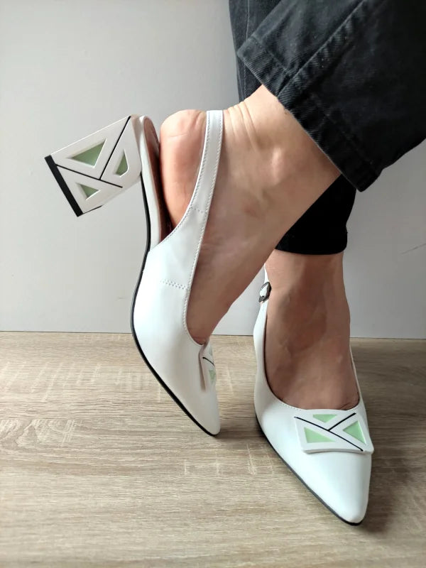 Aceste sandale elegante ies în evidență prin tocul geometric decorat cu elemente vernil și accesoriul asortat de pe vârf, care adaugă o notă modernă și creativă. Vârful ascuțit oferă un aspect rafinat, în timp ce bareta subțire cu cataramă fixează piciorul cu eleganță. Designul artistic transformă această pereche într-o alegere remarcabilă pentru evenimente speciale sau ținute fashion statement.