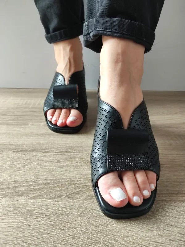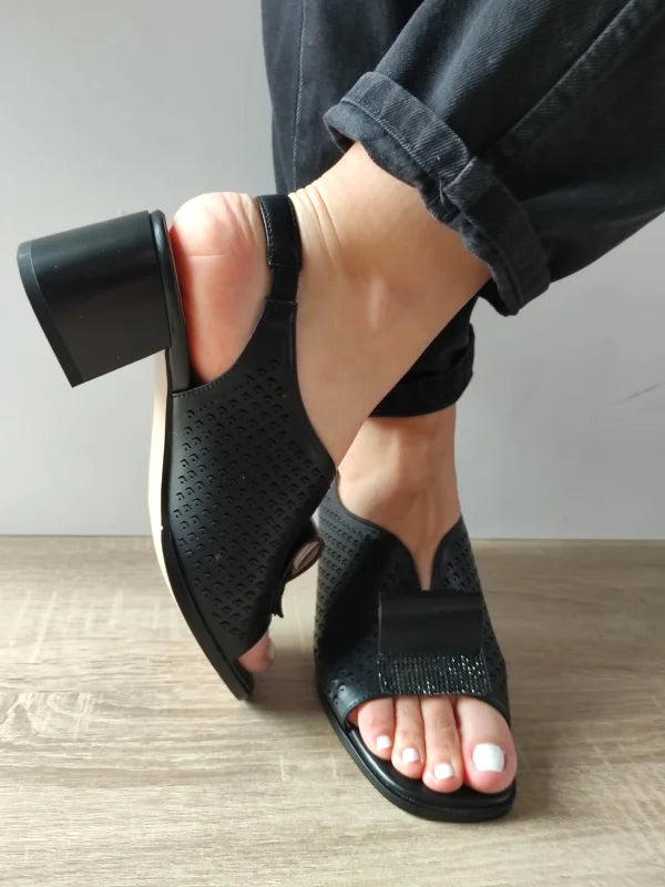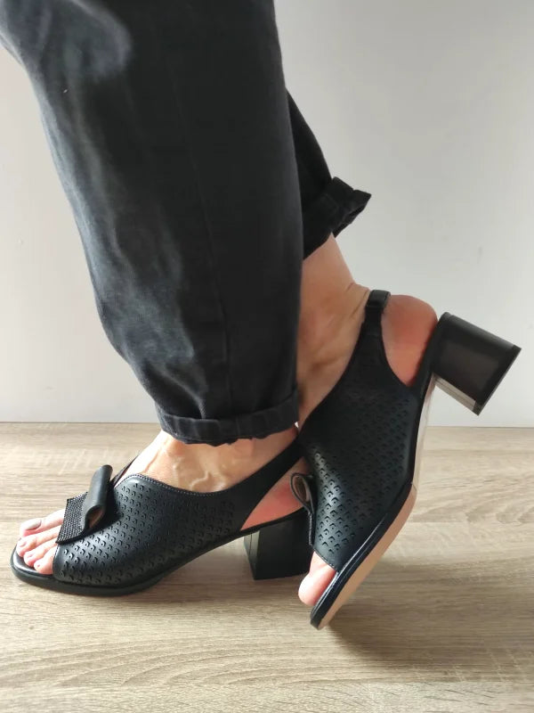 Cu un design perforat elegant și o accesorizare discretă, aceste sandale din piele naturală combină rafinamentul cu funcționalitatea. Tocul gros, mediu, oferă stabilitate, iar decupajele laterale adaugă un plus de confort și lejeritate. Accesoriul frontal strălucitor adaugă un accent vizual subtil, perfect pentru ținute elegante de zi sau de seară.