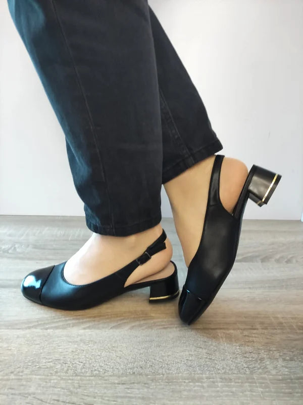 Un model clasic reinterpretat cu rafinament, aceste sandale elegante Karisma îmbină pielea naturală mată cu detalii din piele naturală lăcuită, pentru un look modern și sofisticat. Tocul jos de 4.2 cm, cu un accent metalic discret, oferă eleganță fără a compromite confortul. Vârful rotunjit și decupajul la spate pun în valoare piciorul, iar bareta cu cataramă asigură o fixare sigură și ajustabilă. O alegere perfectă pentru ținute office sau ocazii speciale.