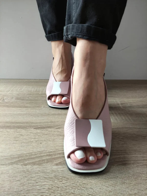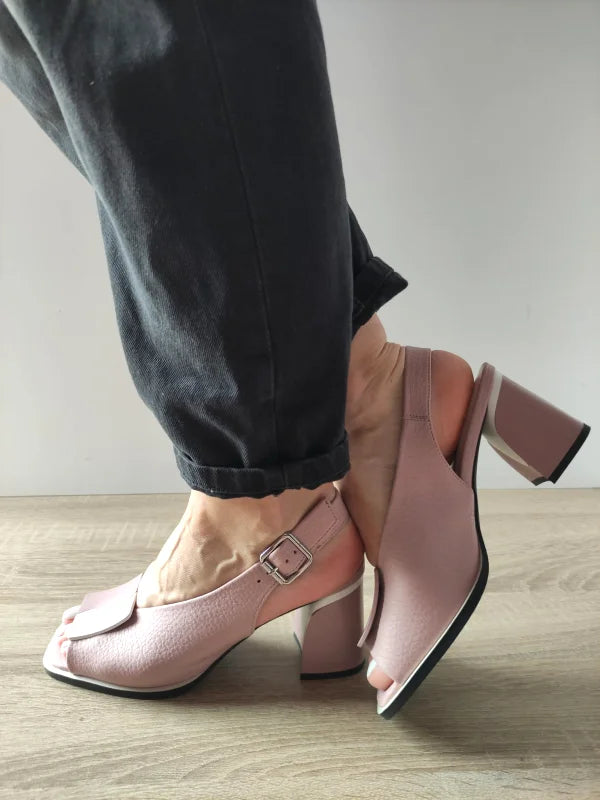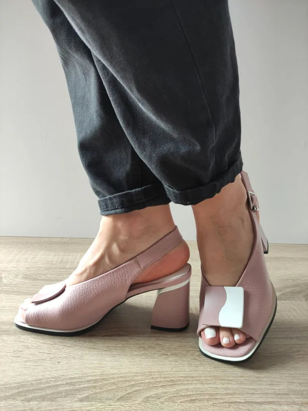 Cu un design contemporan și o nuanță delicată de roz, aceste sandale din piele naturală se remarcă prin aplicația decorativă în două tonuri și finisajele moderne. Tocul gros cu inserție metalizată oferă stabilitate și un look aparte, în timp ce textura pielii adaugă un plus de rafinament.