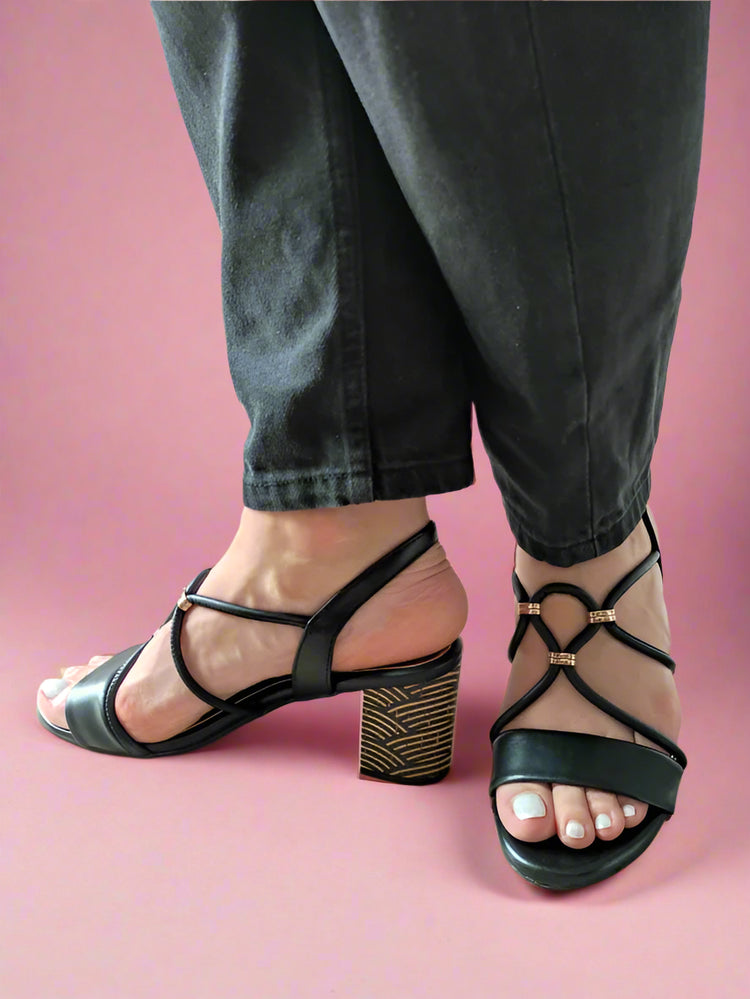 Aceste sandale negre se remarcă prin eleganța liniilor fine și detaliile aurii discrete care accentuează designul sofisticat. Tocul cu model geometric adaugă un plus de originalitate, fiind o alegere inspirată pentru evenimentele în care vrei să atragi privirile.